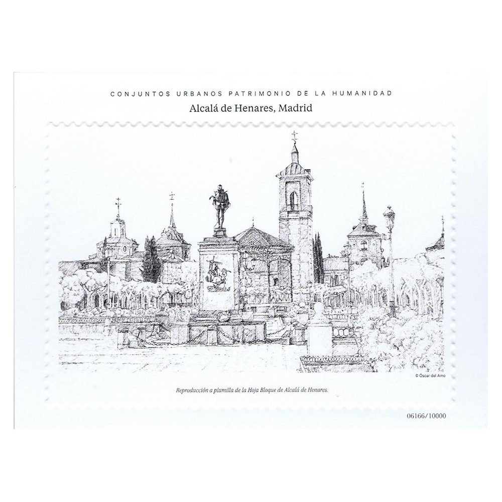 Reproducción a plumilla de la hoja bloque dedicada a Alcalá de Henares, Madrid, dentro de la serie Conjuntos Urbanos Patrimonio de la Humanidad.