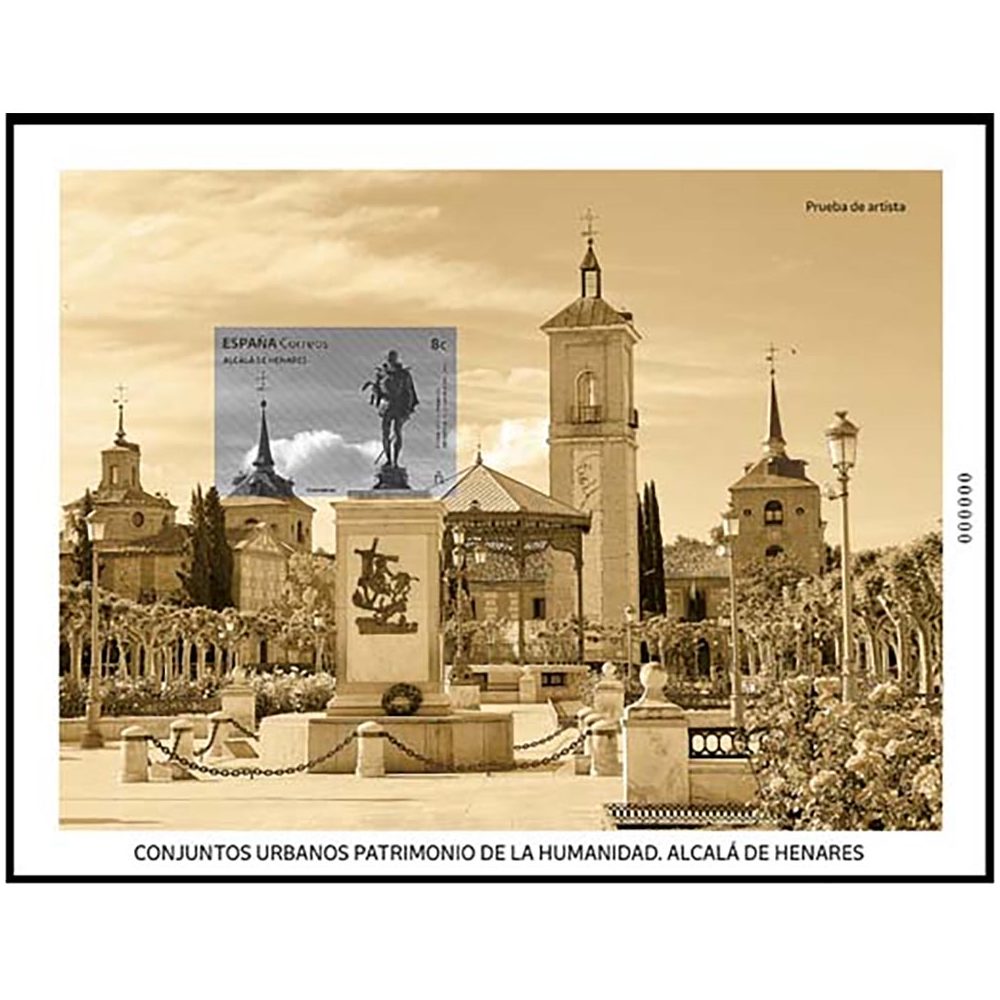 Un fragmento muy representativo de esa silueta urbana es el que forma parte del sello calcográfico que le dedica Correos: la plaza de Cervantes en el corazón de Alcalá de Henares; una ciudad milenaria “tendida al sol”, como la pensó Unamuno, y abrazada por “el claro Henares”, como la cantó Lope de Vega.